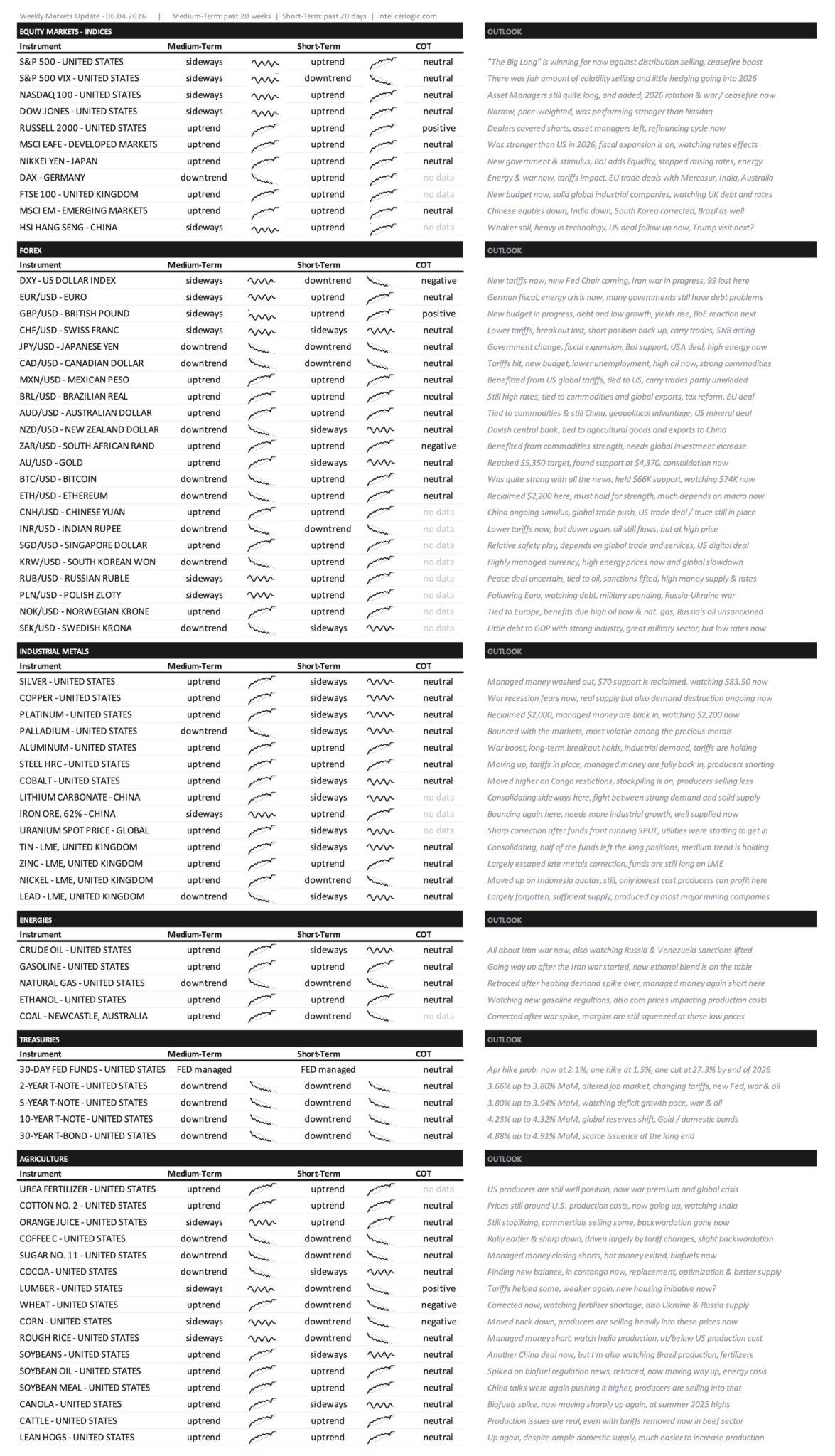 That sets the tone for this week, hopefully not too long. This is update number eighty-two, covering equities, forex, treasuries, metals, energy, and agricultural commodities, as always with an updated summary table and signals across each market.