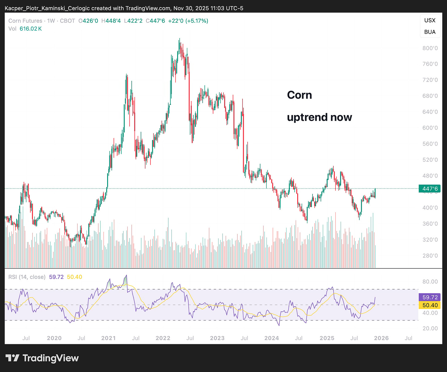 • CORN – UNITED STATES: Sideways 🟨 ➝ Uptrend 🟩