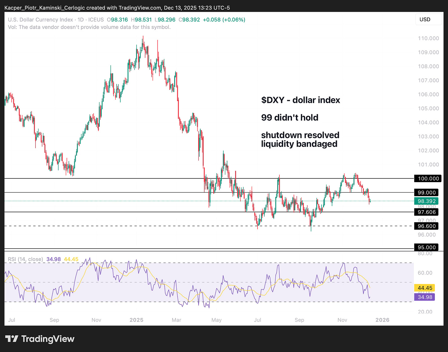 • DXY – US DOLLAR INDEX: Sideways 🟨 ➝ Downtrend 🟥