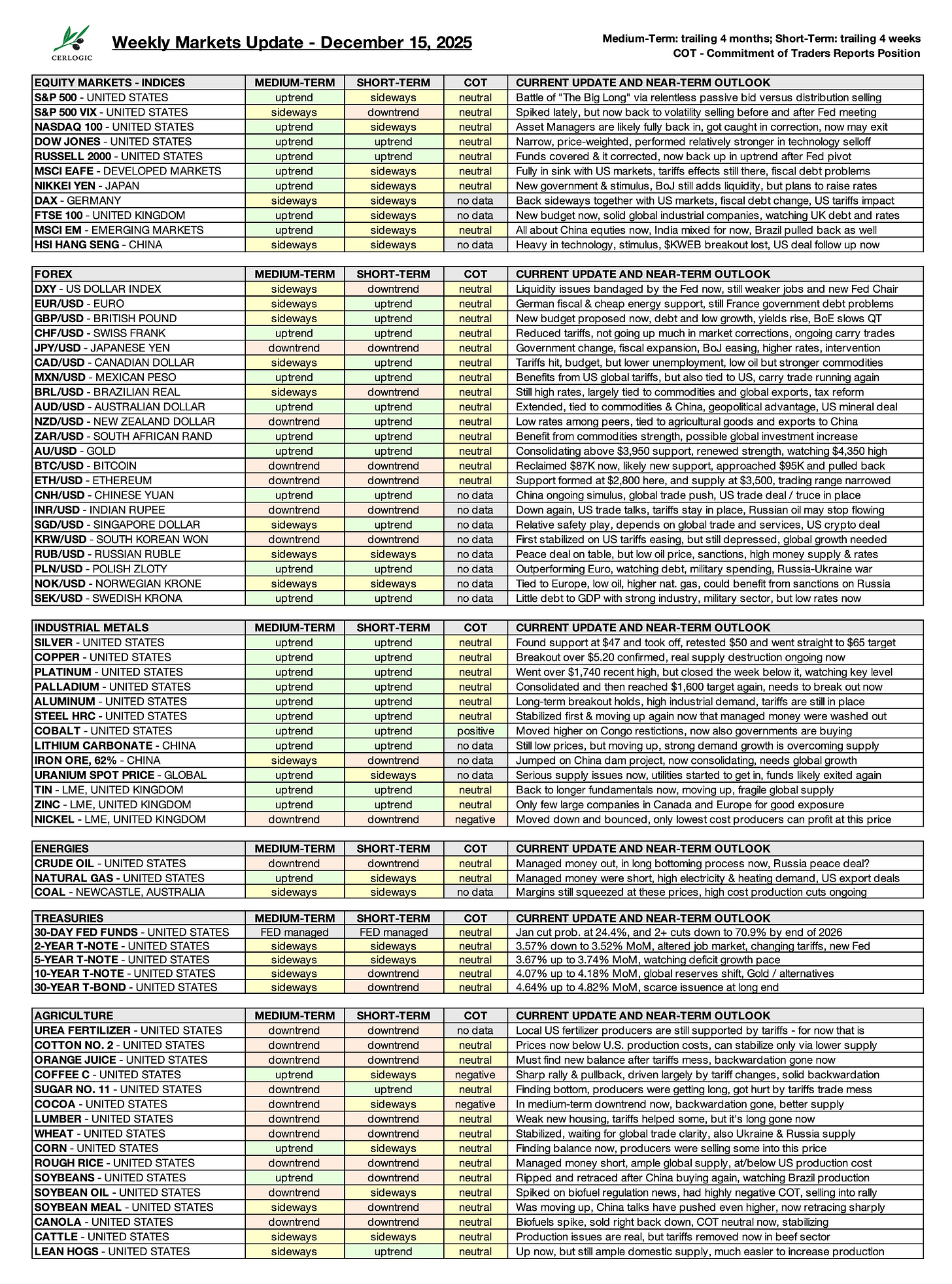 That sets the tone for this week, hopefully not too long. This is update number sixty-five, covering equities, forex, treasuries, metals, energy, and agricultural commodities, as always with a refreshed summary table and signals across each market.