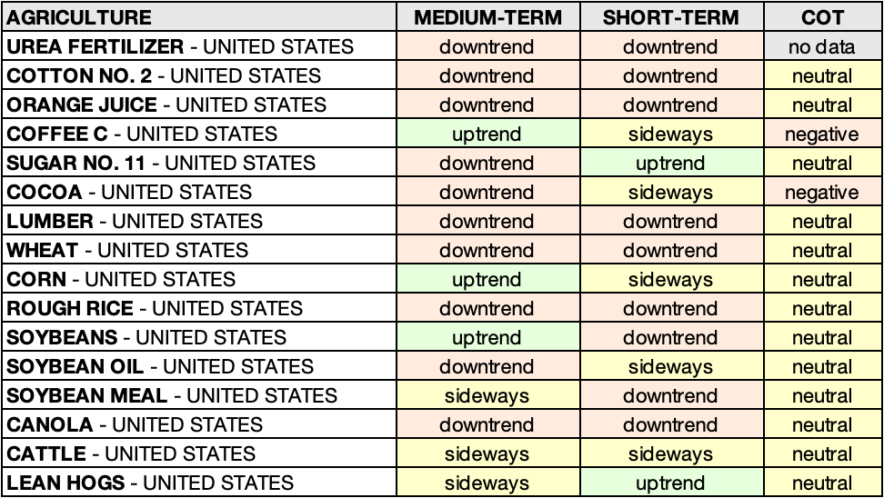 • SOYBEAN MEAL – UNITED STATES: Uptrend 🟩 ➝ Sideways 🟨