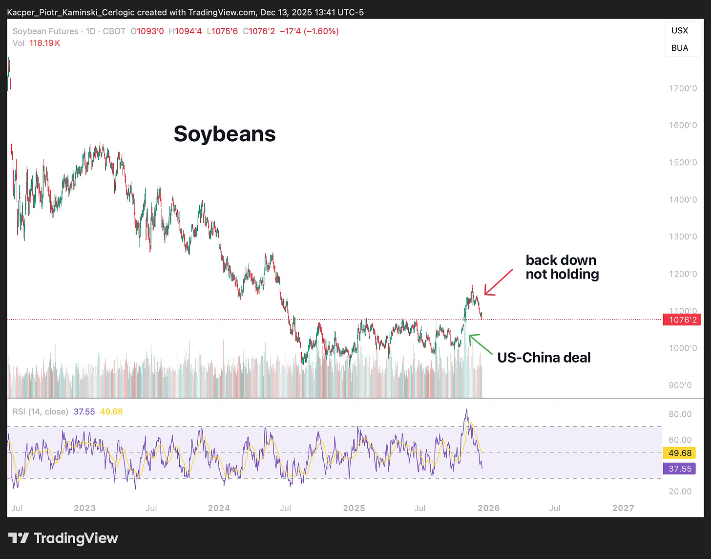 • SOYBEANS – UNITED STATES: Sideways 🟨 ➝ Downtrend 🟥