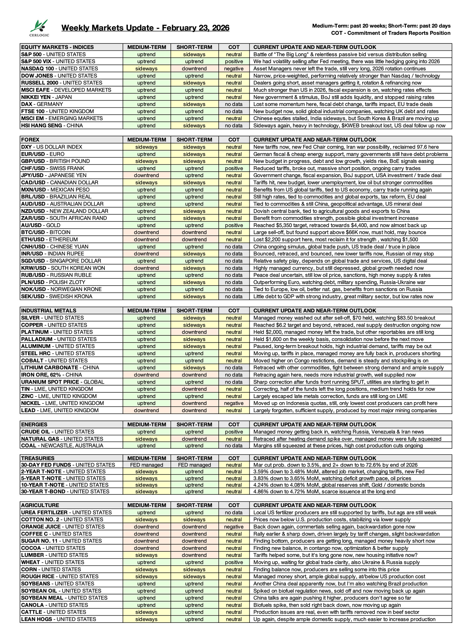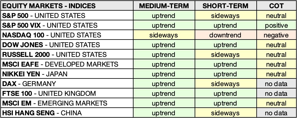 That sets the tone for this week, hopefully not too long. This is update number seventy-five, covering equities, forex, treasuries, metals, energy, and agricultural commodities, as always with a refreshed summary table and signals across each market.
