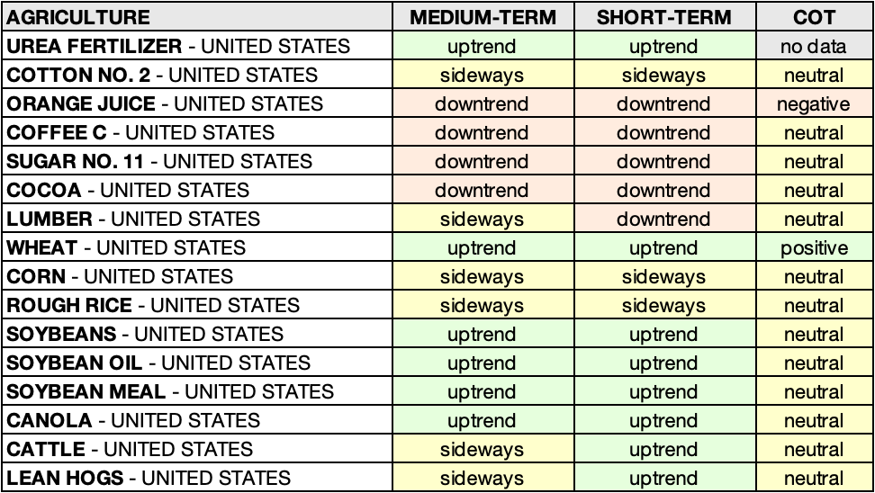 • SOYBEAN MEAL – UNITED STATES: sideways 🟨 ➝ uptrend 🟩