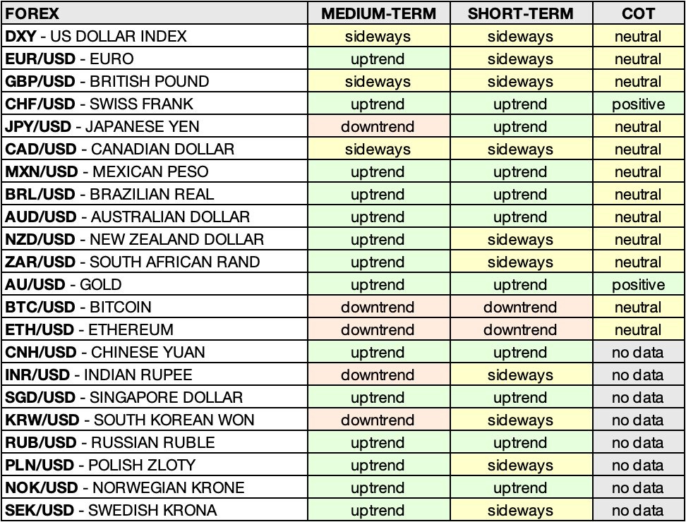 • SEK/USD – SWEDISH KRONA: uptrend 🟩 ➝ sideways 🟨