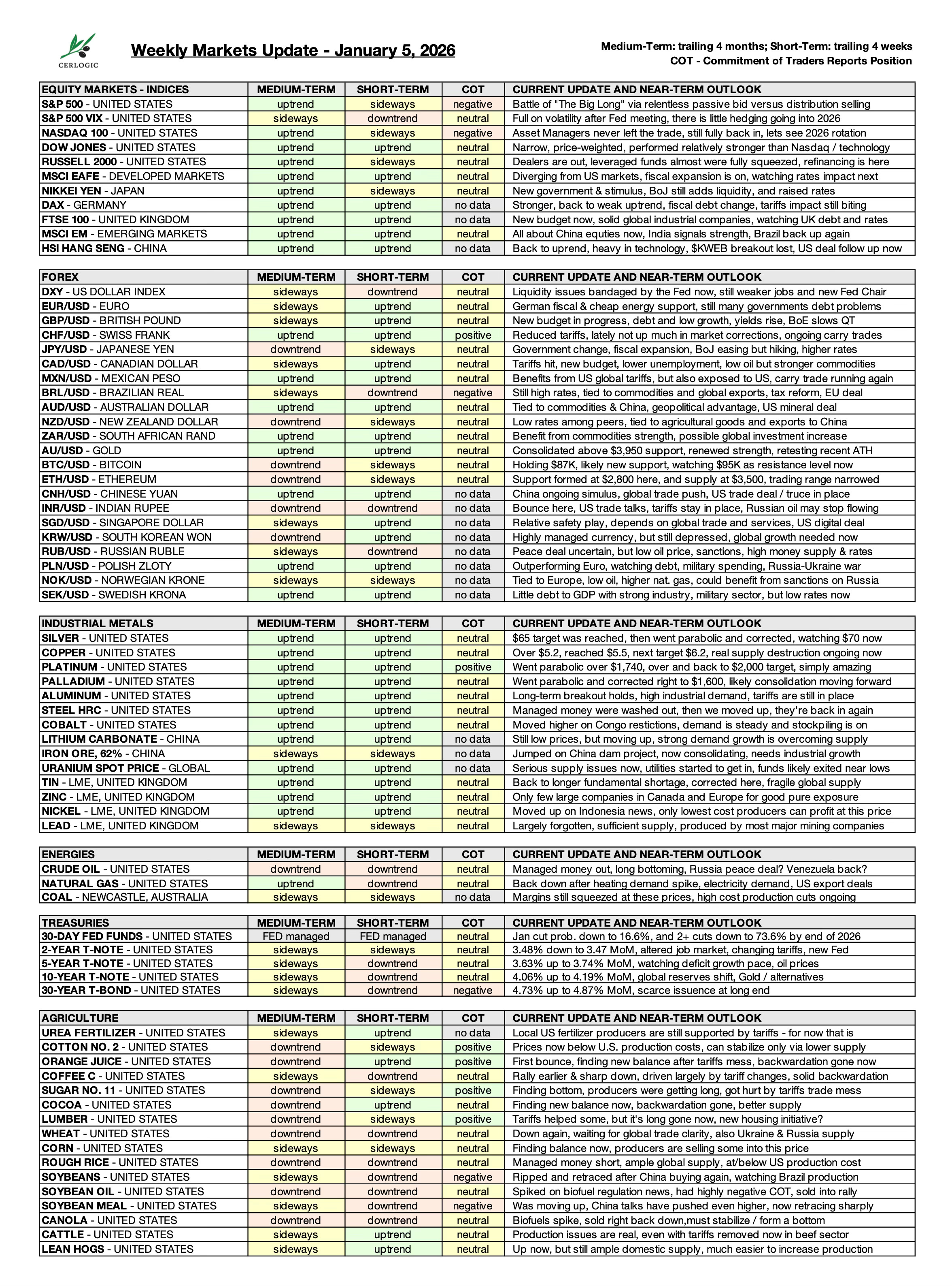 That sets the tone for this week, hopefully not too long. This is update number sixty-eight, covering equities, forex, treasuries, metals, energy, and agricultural commodities, as always with a refreshed summary table and signals across each market.