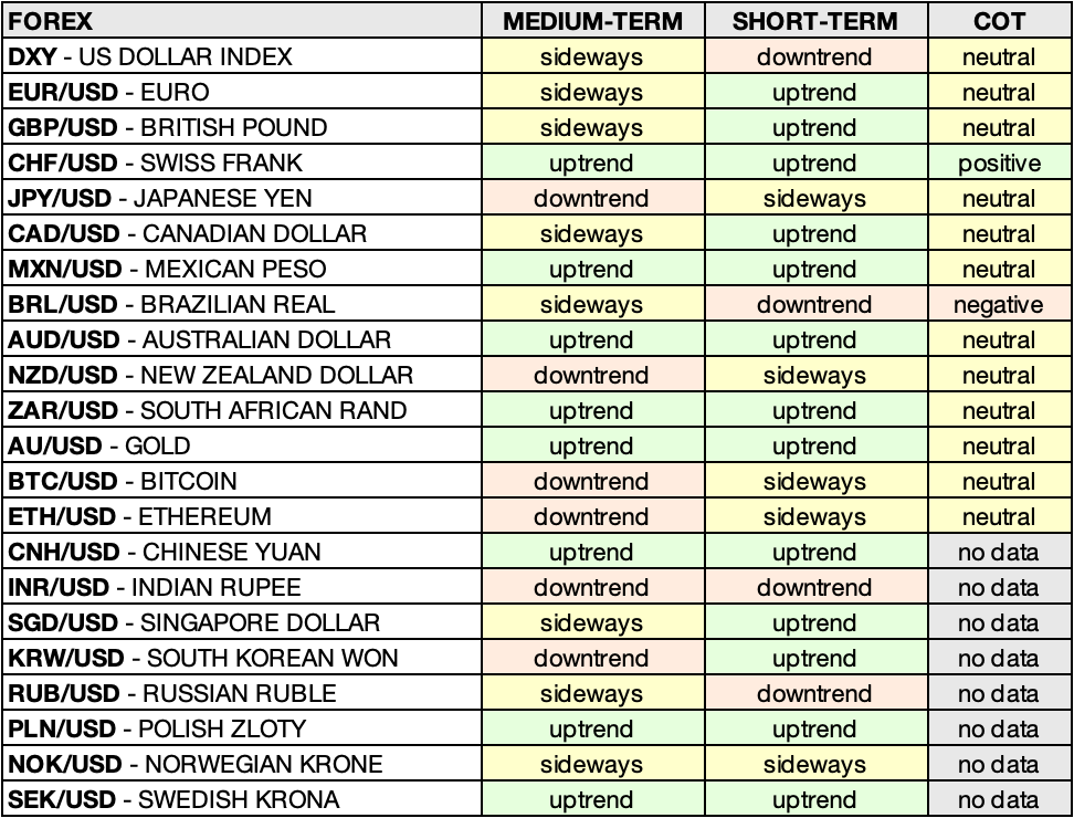 • JPY/USD - JAPANESE YEN: downtrend 🟥 ➝ sideways 🟨