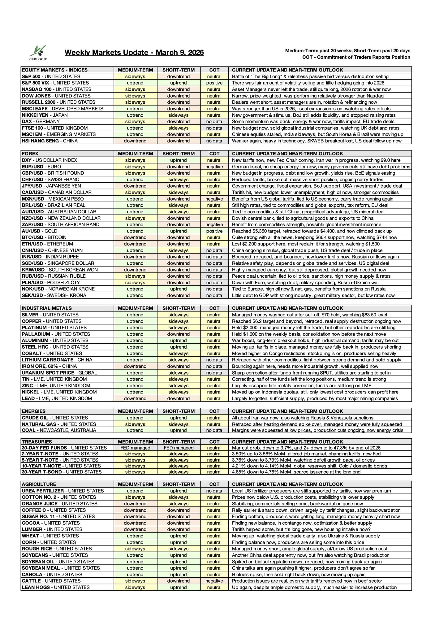 That sets the tone for this week, hopefully not too long. This is update number seventy-seven, covering equities, forex, treasuries, metals, energy, and agricultural commodities, as always with a refreshed summary table and signals across each market.