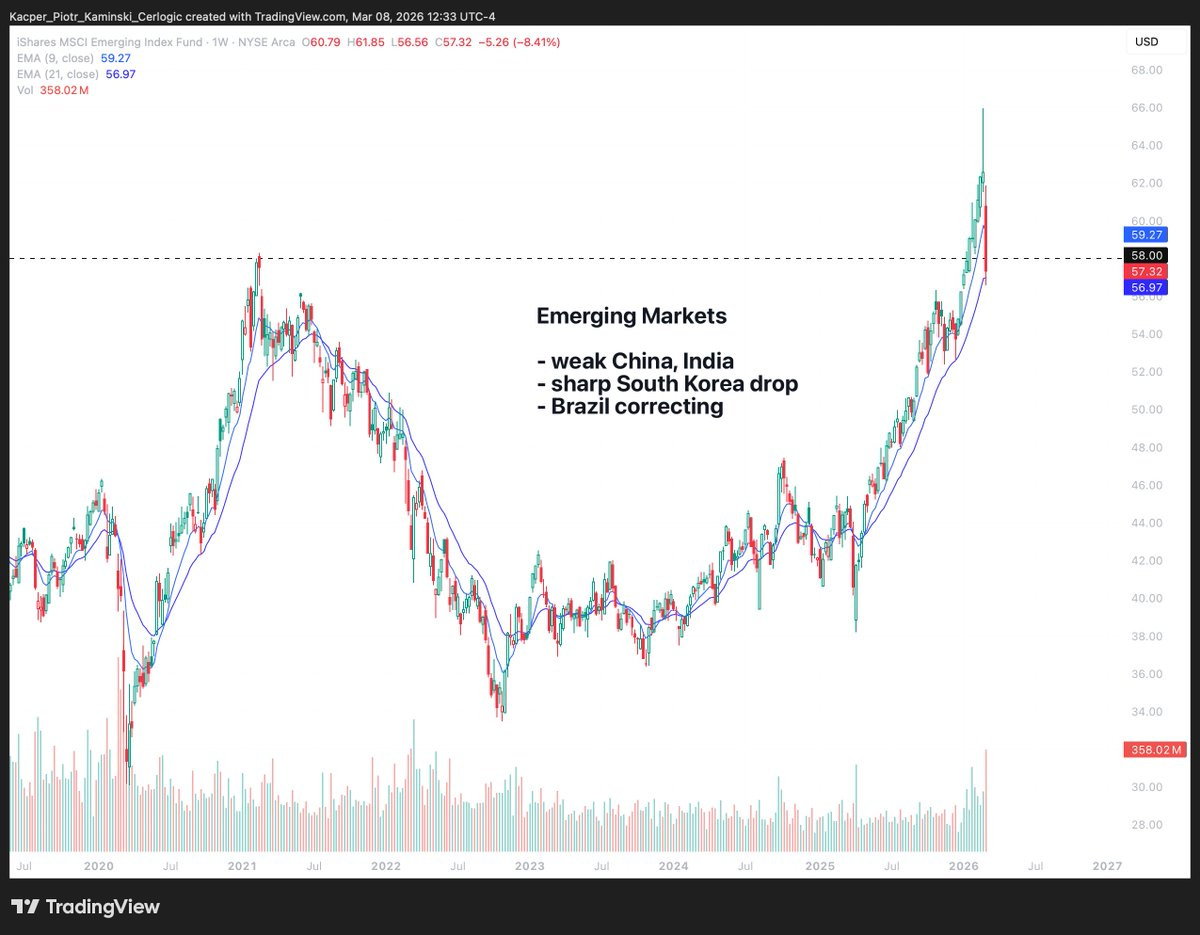 • MSCI EM – EMERGING MARKETS: uptrend 🟩 ➝ downtrend 🟥