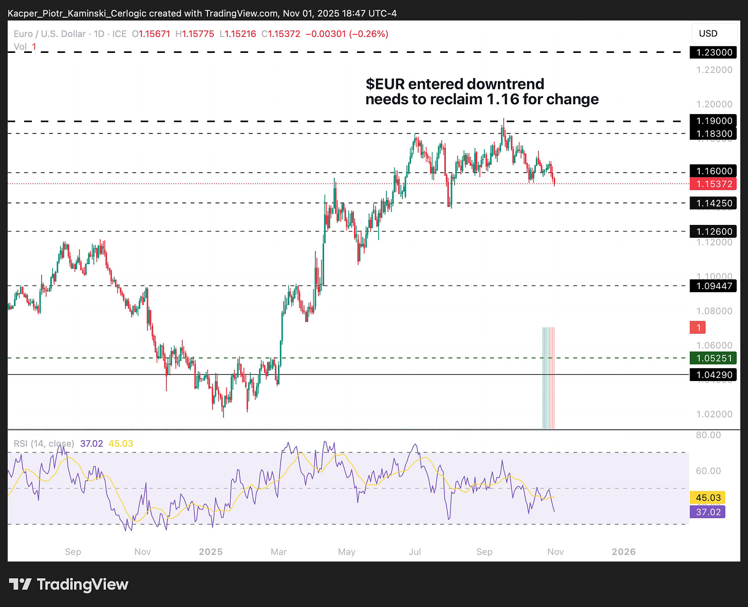 • CHF/USD – SWISS FRANC: Sideways 🟨 ➝ Downtrend 🟥