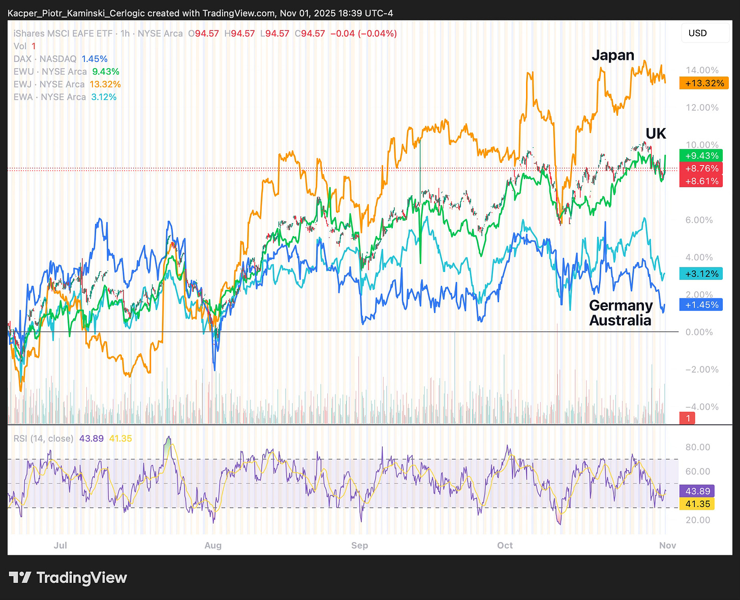 • MSCI EAFE – DEVELOPED MARKETS: Uptrend 🟩 ➝ Sideways 🟨
