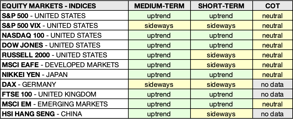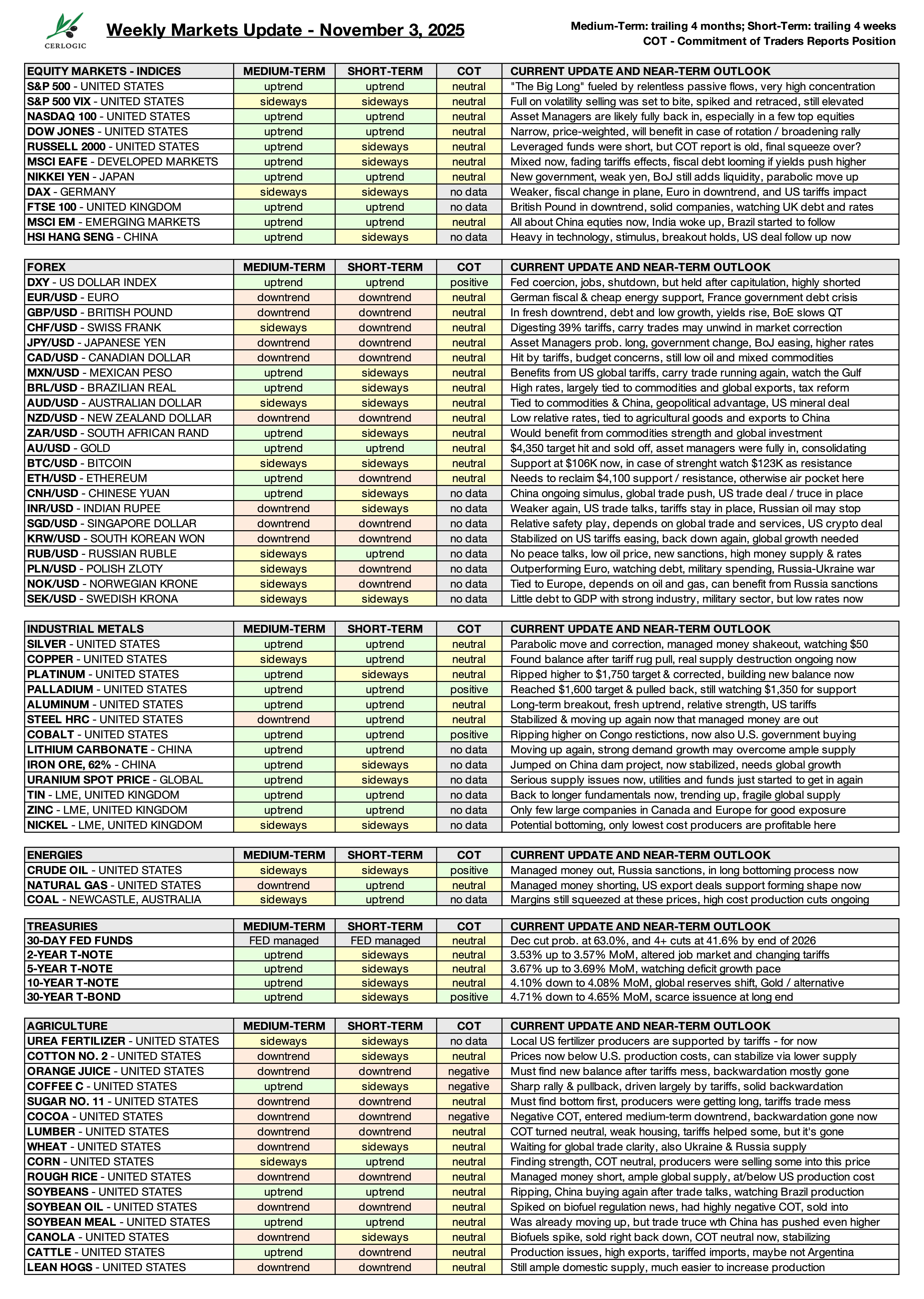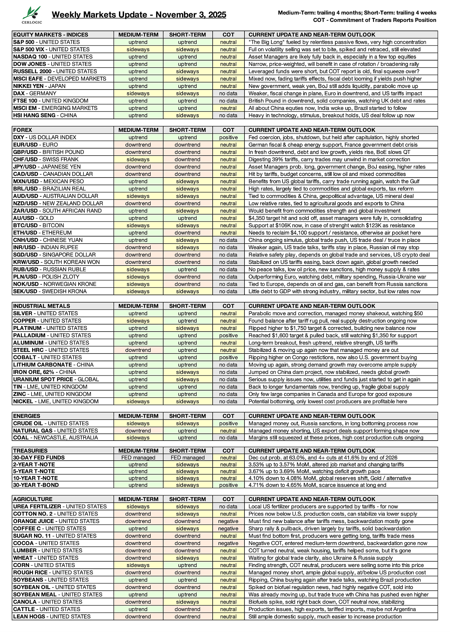 That sets the tone for this week, hopefully not too long. This is update number fifty-nine, covering equities, forex, treasuries, metals, energy, and agricultural commodities, as always with a refreshed summary table and signals across each market.
