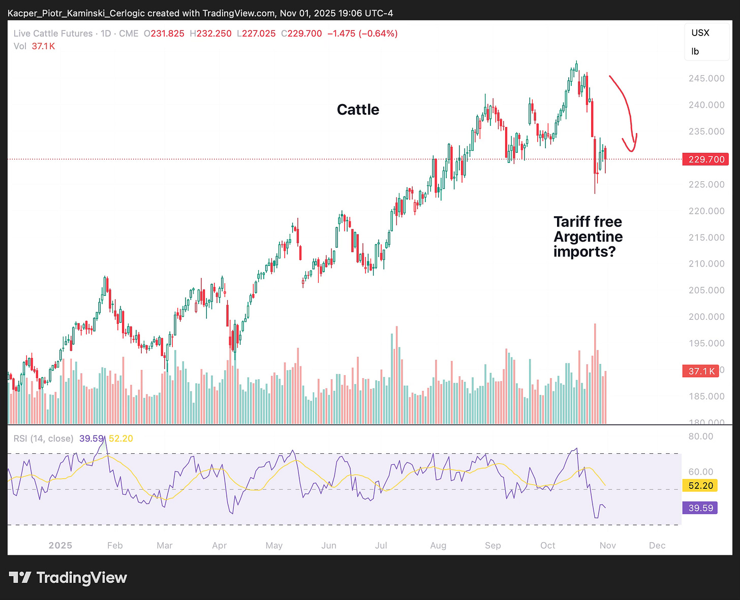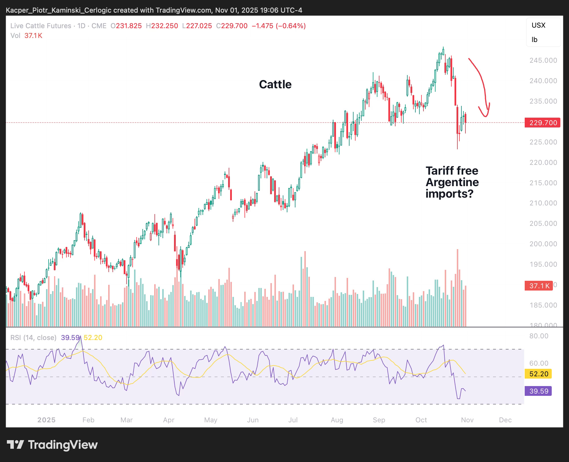• CATTLE – UNITED STATES: Sideways 🟨 ➝ Downtrend 🟥