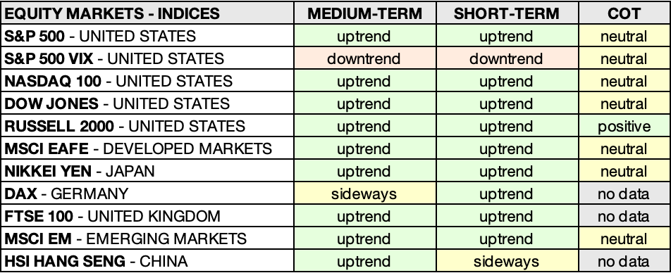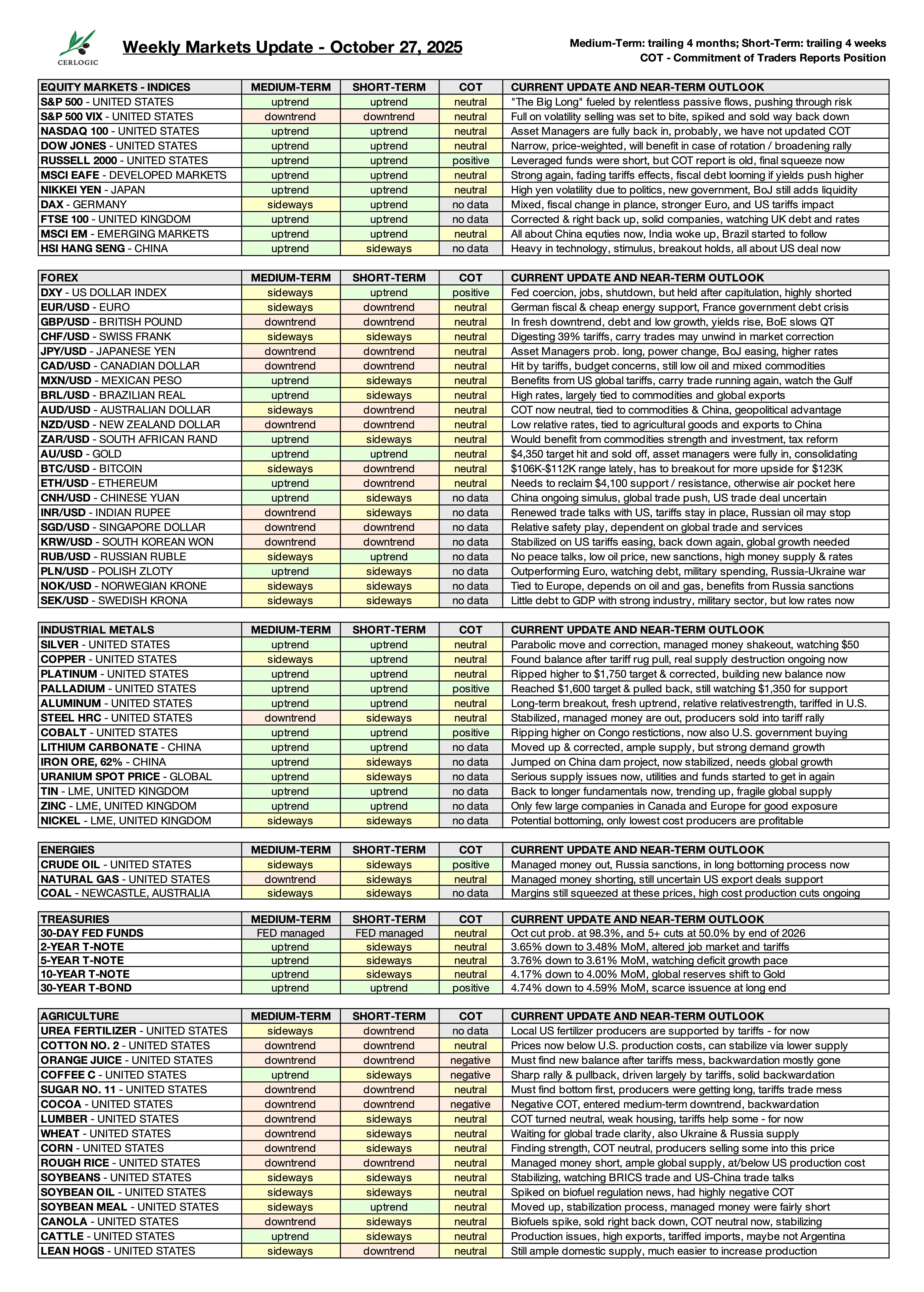 That sets the tone for this week, hopefully not too long. This is update number fifty-eight, covering equities, forex, treasuries, metals, energy, and agricultural commodities, as always with a refreshed summary table and signals across each market.